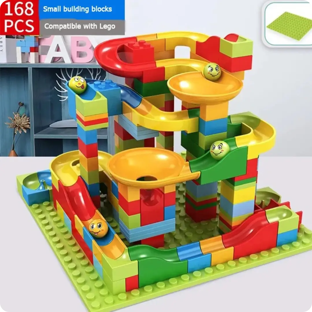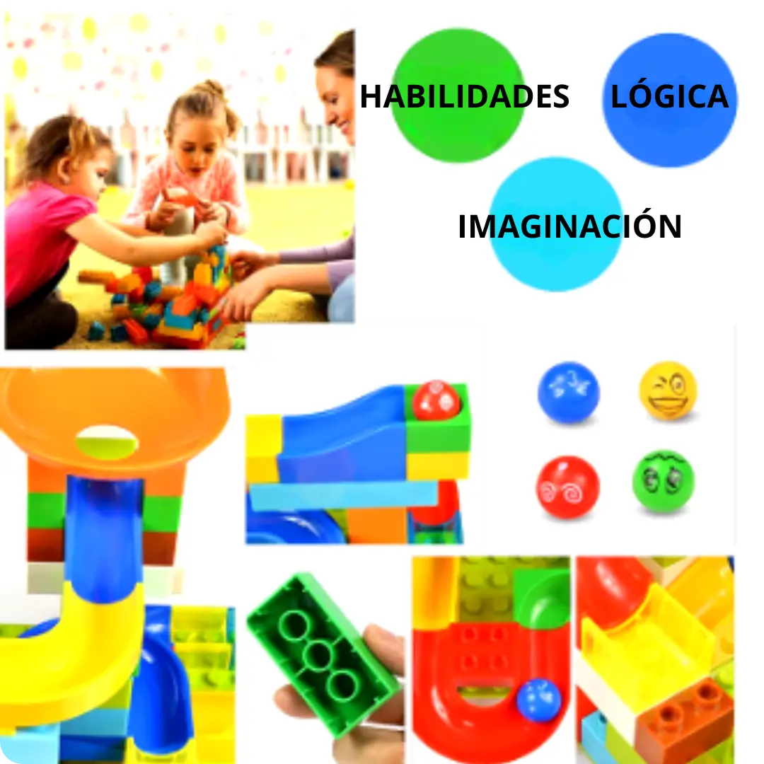 Con 168 piezas especialmente diseñadas, tu hijo podrá construir una pista de tobogán en 3D, permitiendo que las canicas se deslicen y giren a través de increíbles laberintos