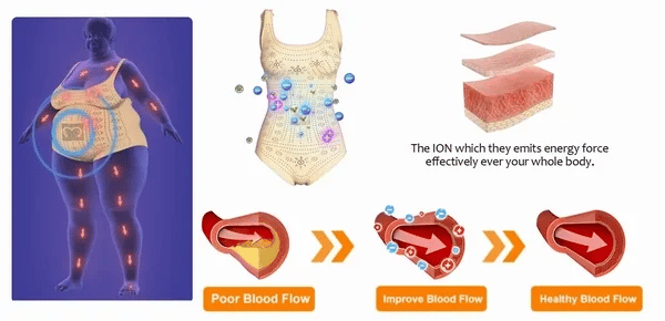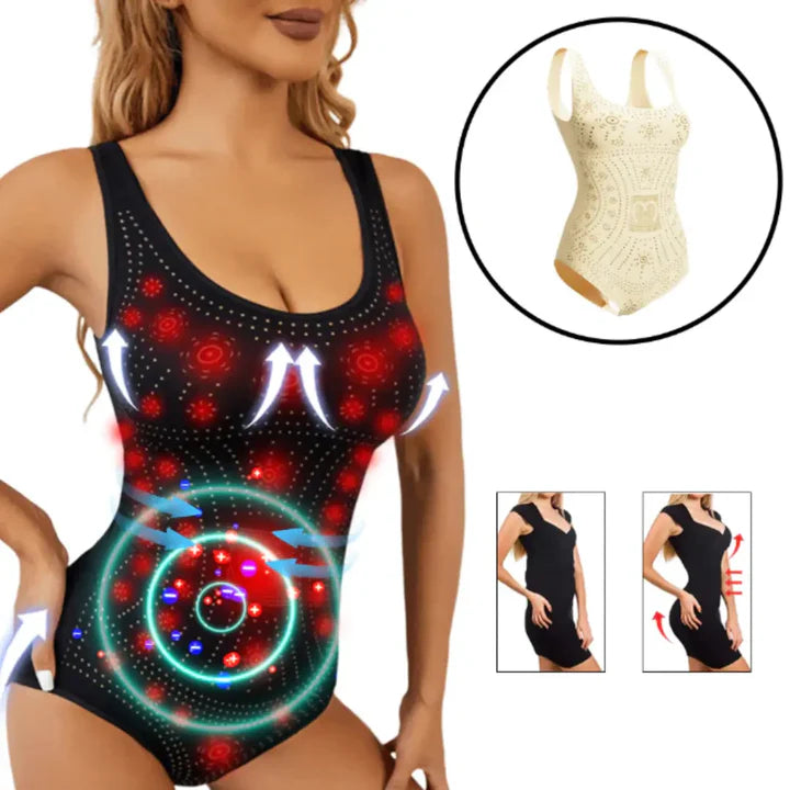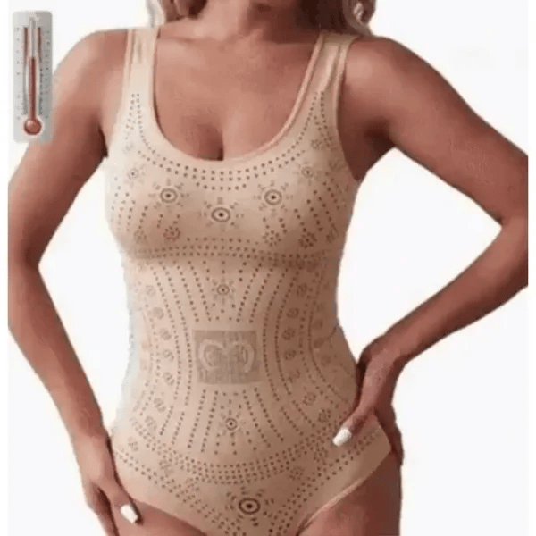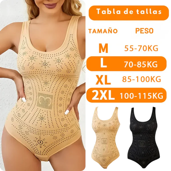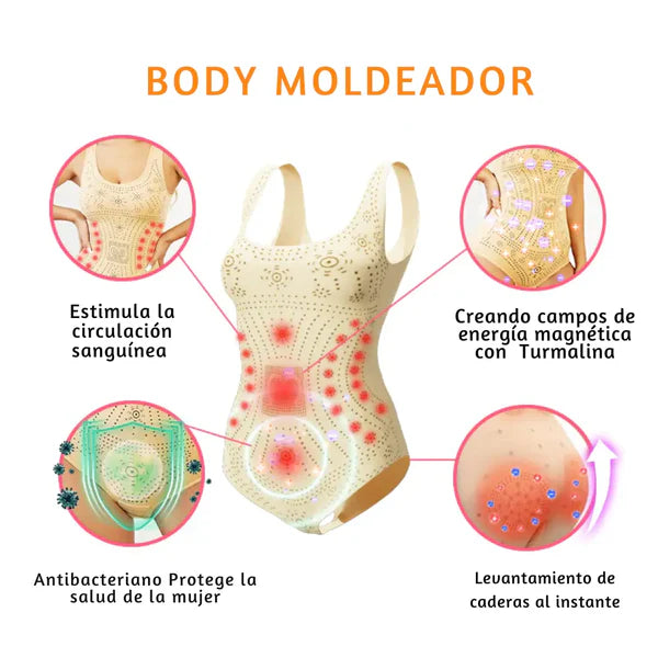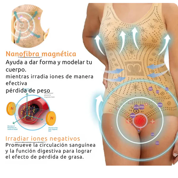 El body moldeadora tiene 3000 cristales de turmalina incrustados en toda el area, que iberan iones negativos para energizar su prenda.