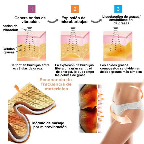 EI material de masaje integrado en el body moldeador utiliza microvibraciones, utilizando tecnología de vibración de baja frecuencia. Con movimientos ligeros del cuerpo, las vibraciones se transfieren al módulo amplificador de vibración, que hace que todo el tejido vibre a frecuencias específicas y estimule grupos de músculos específicos. Esto imita el efecto del masaje manual.