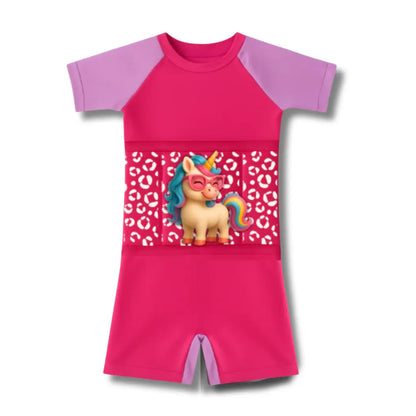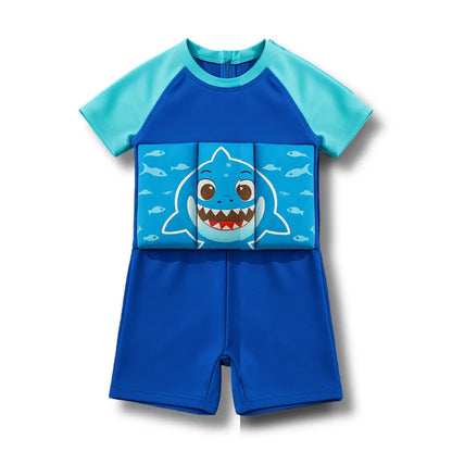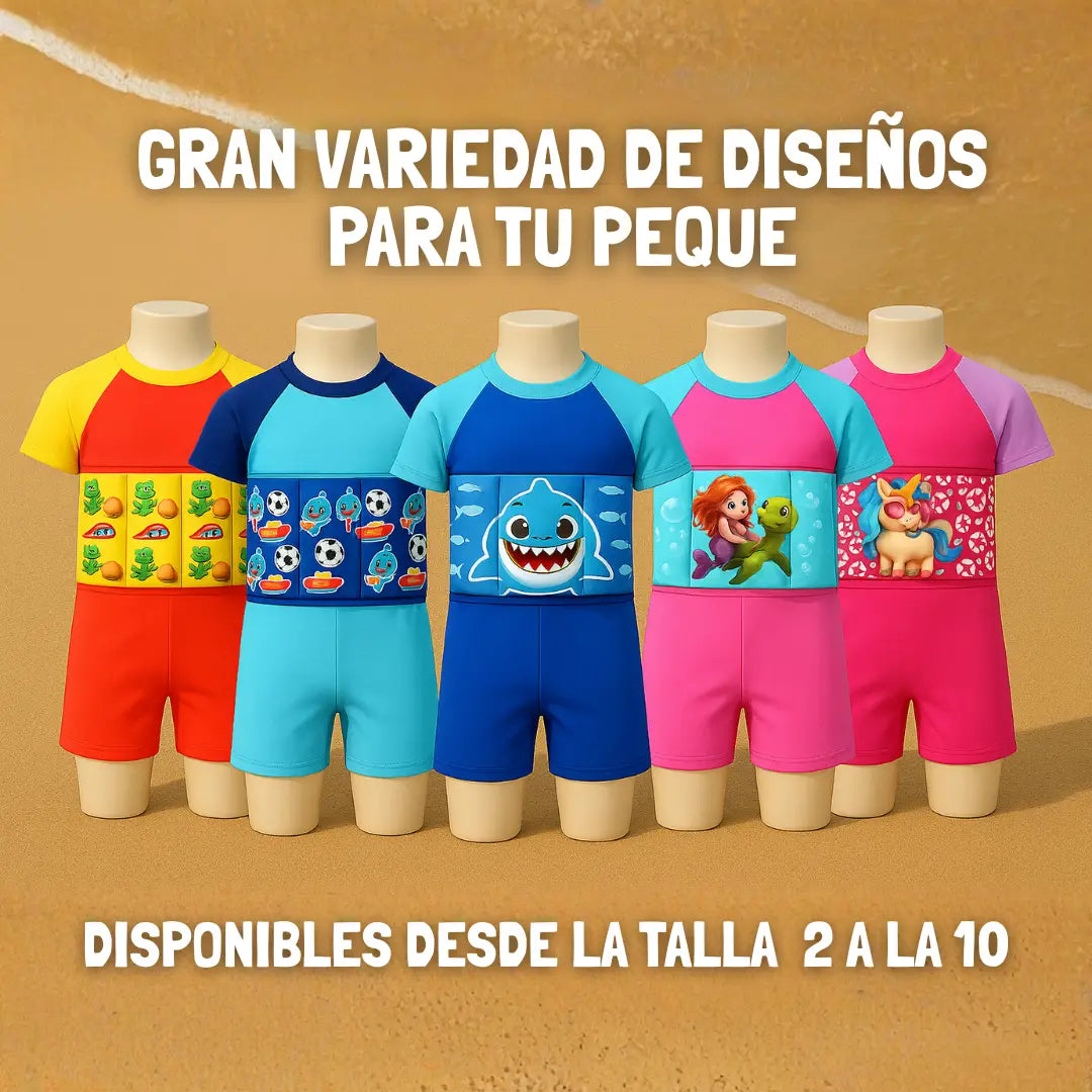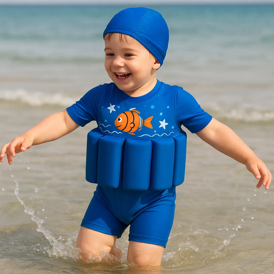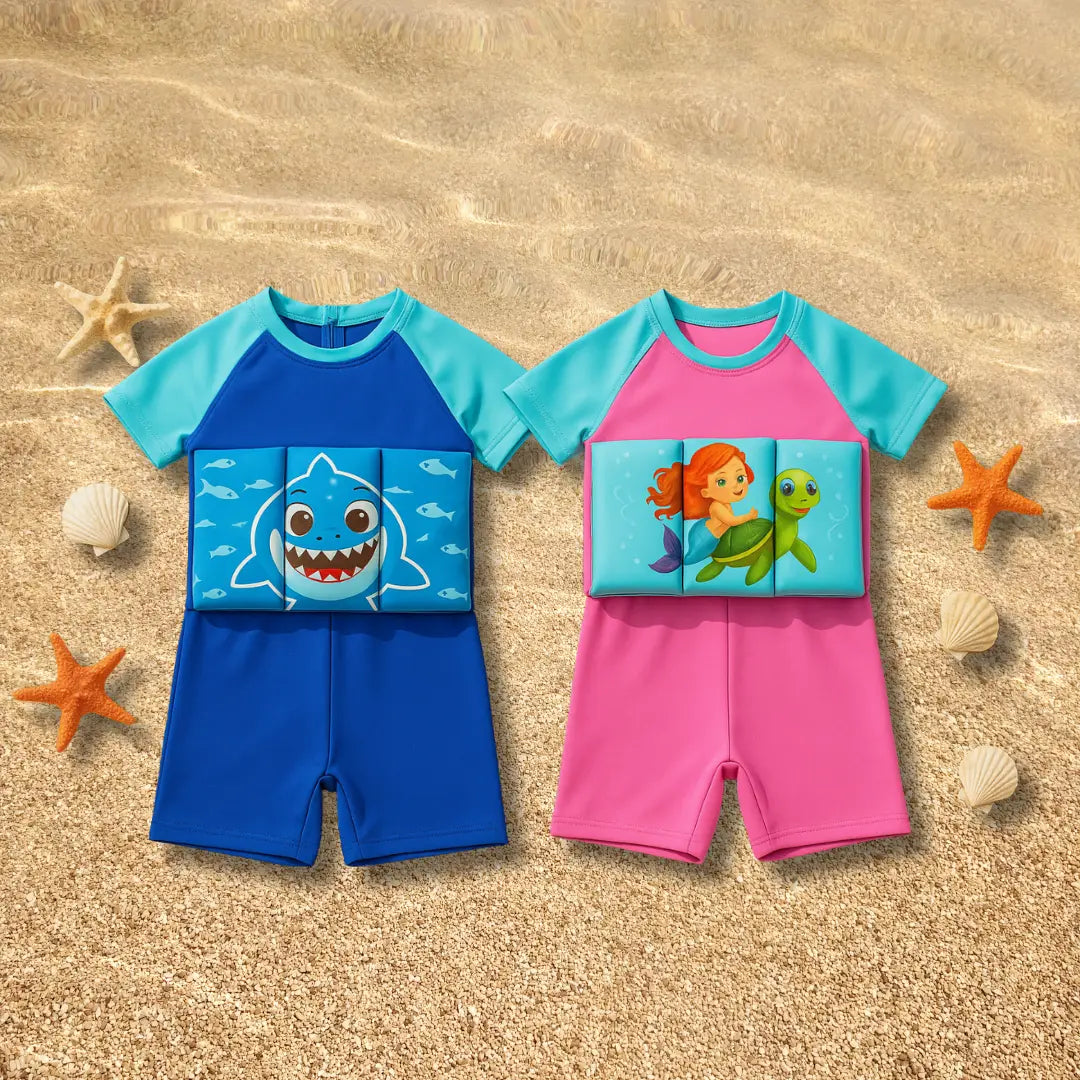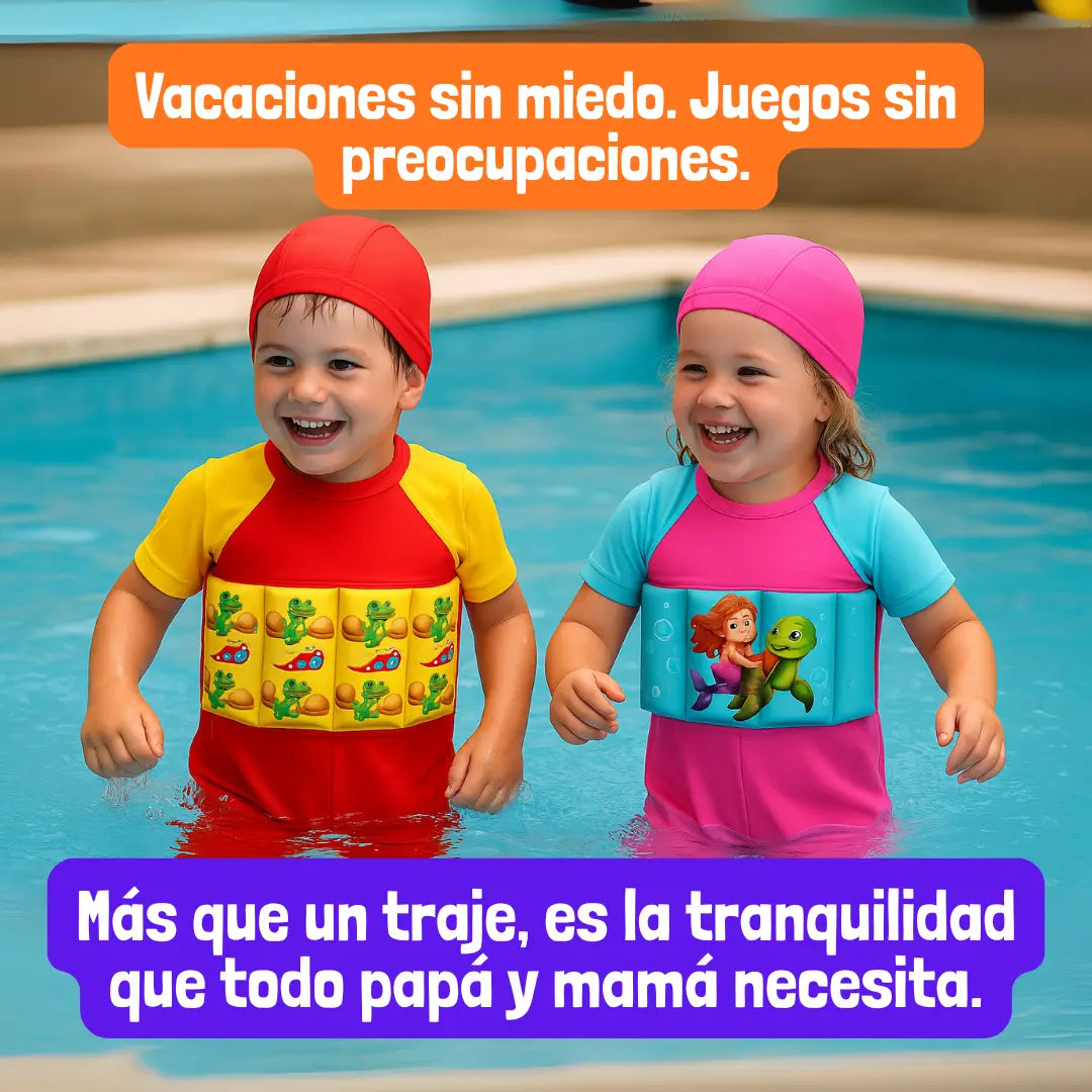 Este traje combina la comodidad de un enterizo con flotadores integrados, permitiendo a los niños divertirse, explorar y ganar confianza en el agua — ¡mientras están seguros!